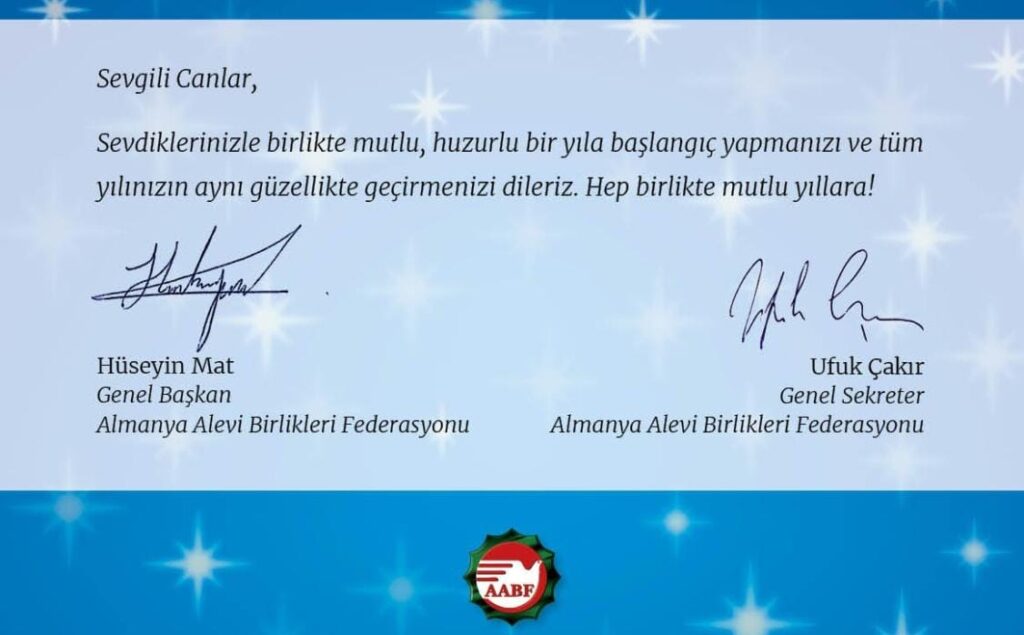 (AABF) AVRUPA ALEVİ BİRLİKLERİ FEDERASYONU’NUN YENİ YIL MESAJI (AABF) AVRUPA ALEVİ BİRLİKLERİ FEDERASYONU’NUN YENİ YIL MESAJI Bu yazı 31 Aralık 2022 tarihinde Anadolunun Sesi Tokat tarafından yazılmıştır.