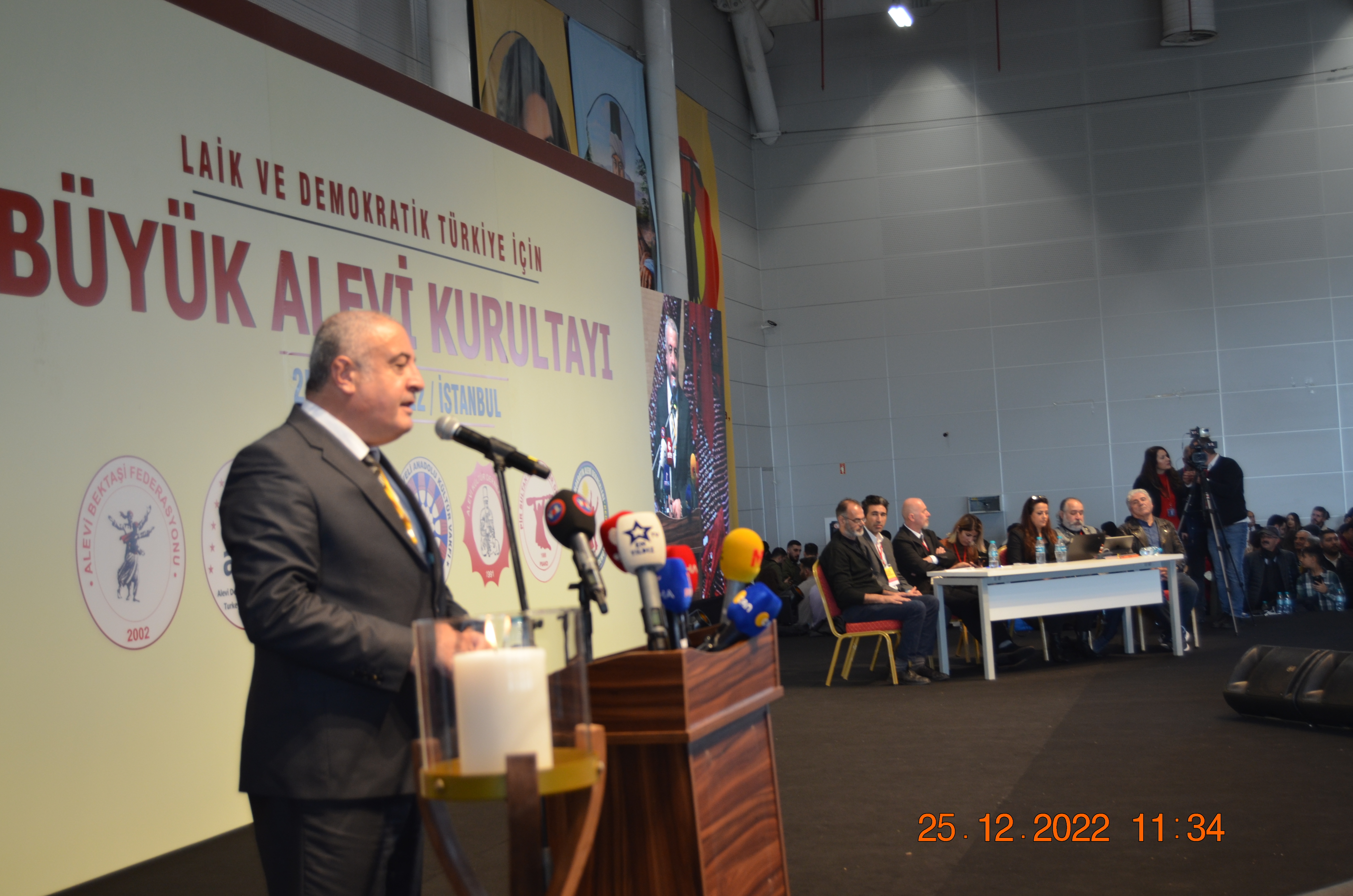 HBVAKV Genel Başkanı Ercan Geçmez ise kurultaya hazırlık sürecinde ülke genelinde birçok Alevi köyünü gezdiklerini anlatırken, Alevilerin kamusal hizmetten yoksun kaldıklarını bir kez daha gözlemlediklerini kaydetti. Geçmez, “Bizi tarif edenlere sesleniyoruz; “Çekin elinizi inancımızdan.” Alevilere yeni bir gömlek giydirmeye çalışıyorlar. Alevileri kendilerine benzetmeye çalışıyorlar. Alevi çocuklarına zorla namaz kıldırdılar, oruç tutturdular. Toplumsal yüzleşme istiyoruz. Bütün dergahlarımızı teslim edin, dedik. Birçok dergahımız camiye çevrildi. Aleviler, Diyanet İşleri Başkanlığı’nın kapatılmasını istedi. Valiler ve kaymakamlar tek bir partinin üyesi gibi Alevi köylerine, Alevilere zulmediyorlar. Biz bu ülkenin yurttaşız. Eşit yurttaşlık istiyoruz. Alevilerin hiçbir sorununu çözmediniz. Bizim şiarımız barış, dostluktur” dedi.